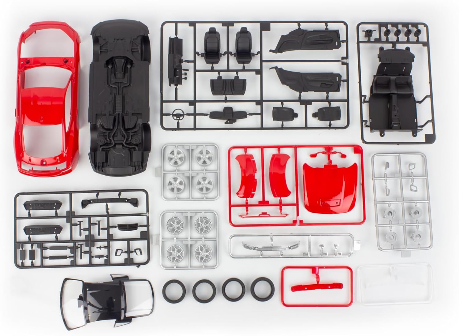 Molded in red, silver, black, transparent red, and clear, plus authentic soft tires.